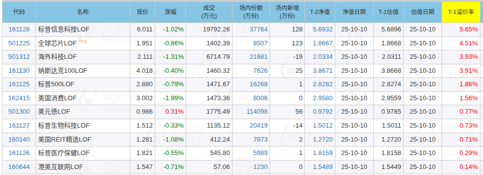 美股LOF标普信息科技LOF目前t-1溢价率约为5%,纳斯达克100LOF也溢价3.9%,主要周五美股大跌,而大A场内的相关LOF却没怎么跌. 比如周五纳指100LOF跌了-3%多,而大A由于抄底的人较多,场内的纳斯达克100LOF只跌了-0.4%.