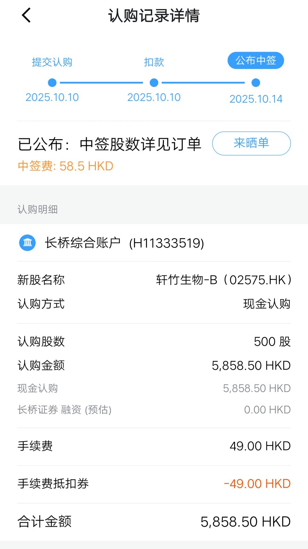 本来不抱希望用1手现金摸奖的轩竹生物-B, 居然还中签了.预计能吃个肉.