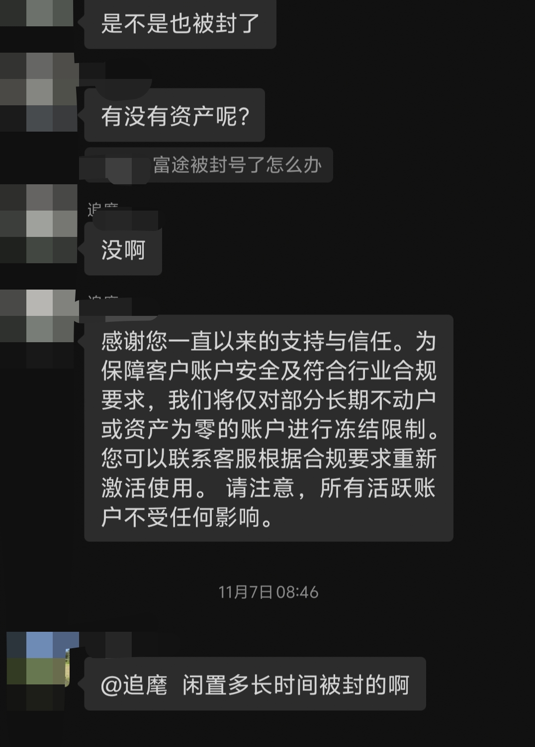 最近在几个港美股打新群里,有部分小伙伴反馈,之前开通的富途和老虎账号,因为里面有段时间没有资产,账号被封禁了。