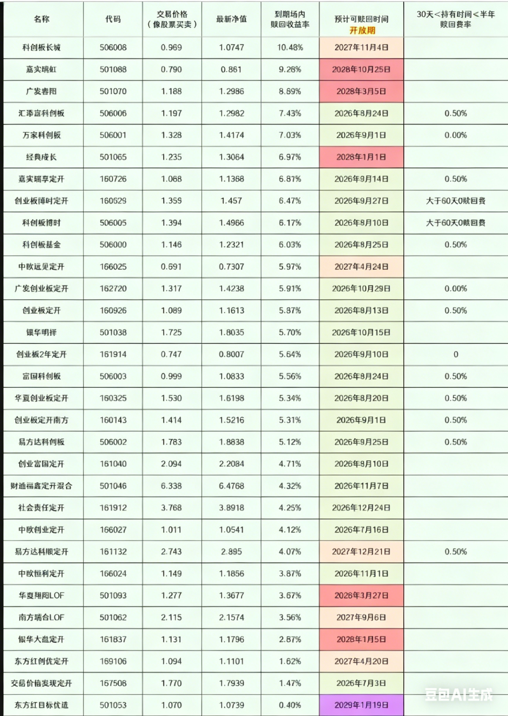 - 定开基金只有开放期能赎回,要是错过开放期没赎回,就得再等下一轮封闭期,钱又被锁住了;
