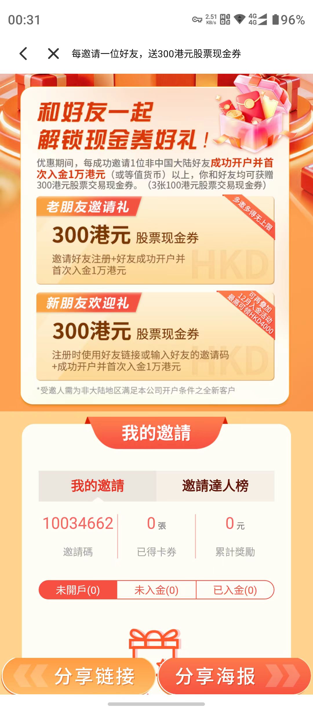 每成功邀请1位非中国大陆好友成功开户并首次入金1万港元(或等值货币)以上,你和好友均可获赠300港元股票交易现金券。(3张100港元股票交易现金券