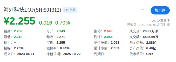 海外科技LOF溢价率持续溢价了几天,今天溢价率到了9.8%.
