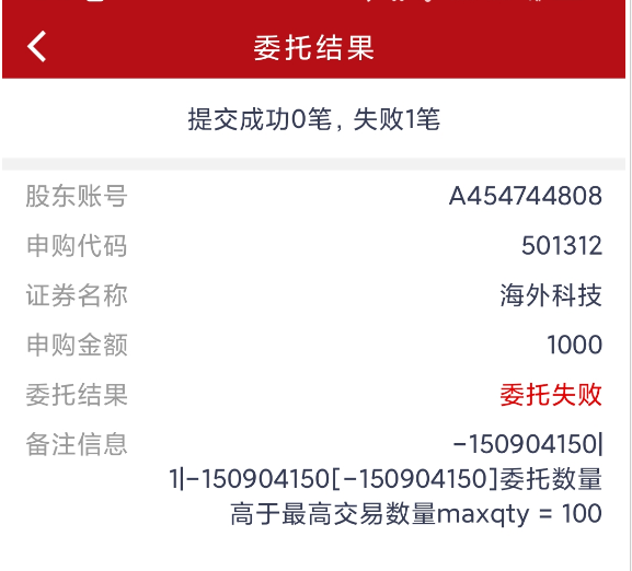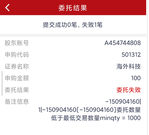 银河的app申购的时候,因为沪市最低申购1000, 如果你填入1000元的时候,提示错误. 填入100元的时候,同样也会报错.